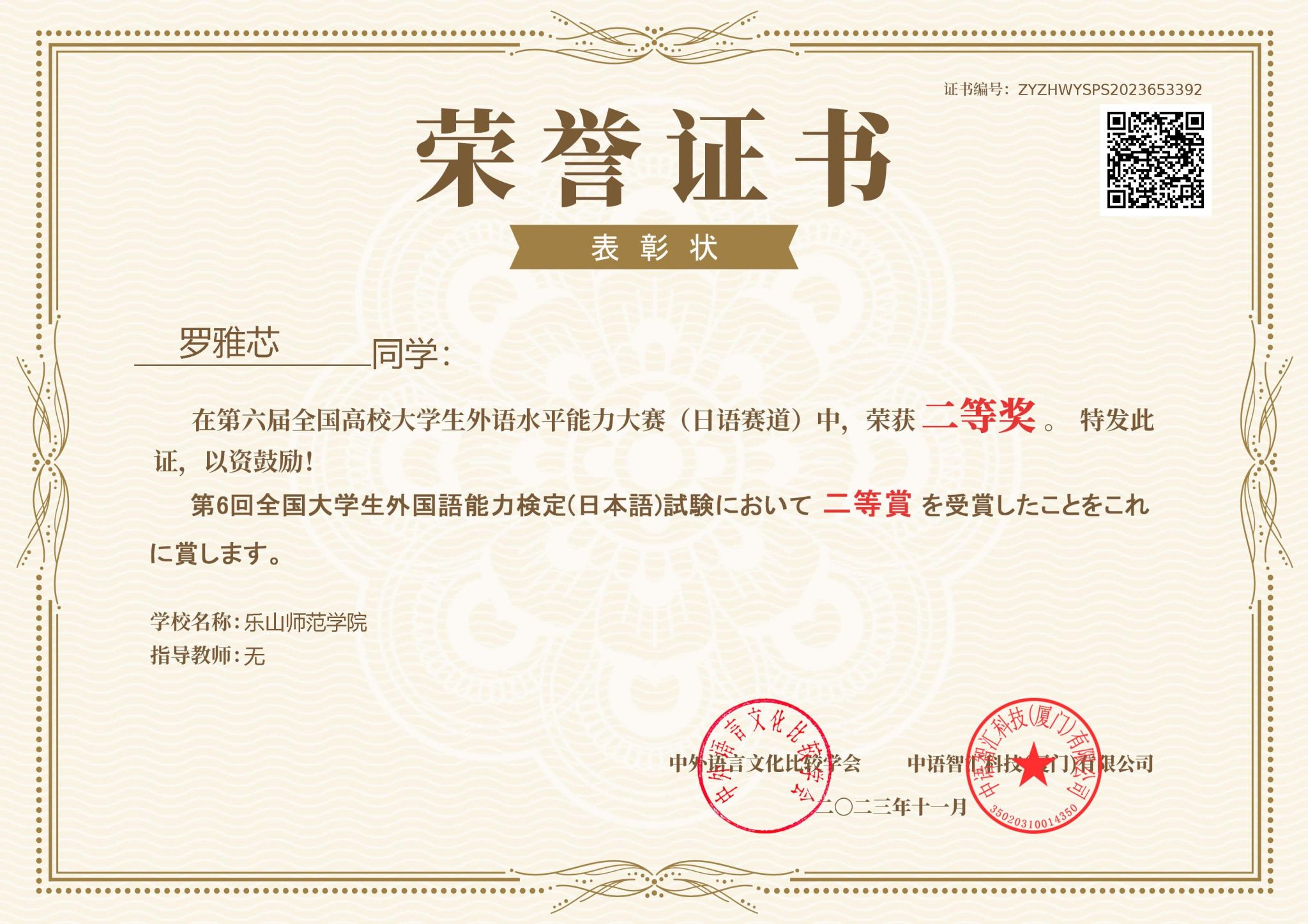 11月中旬,由中外语言文化比较学会举办的第六届全国高校大学生外语水平能力大赛决赛圆满落幕。我校日语专业2023级李飞扬、2020级罗雅芯2位同学经过激烈角逐,从全国160余所高校的9000余名学生中脱颖而出,均取得了全国决赛二等奖的优异成绩。