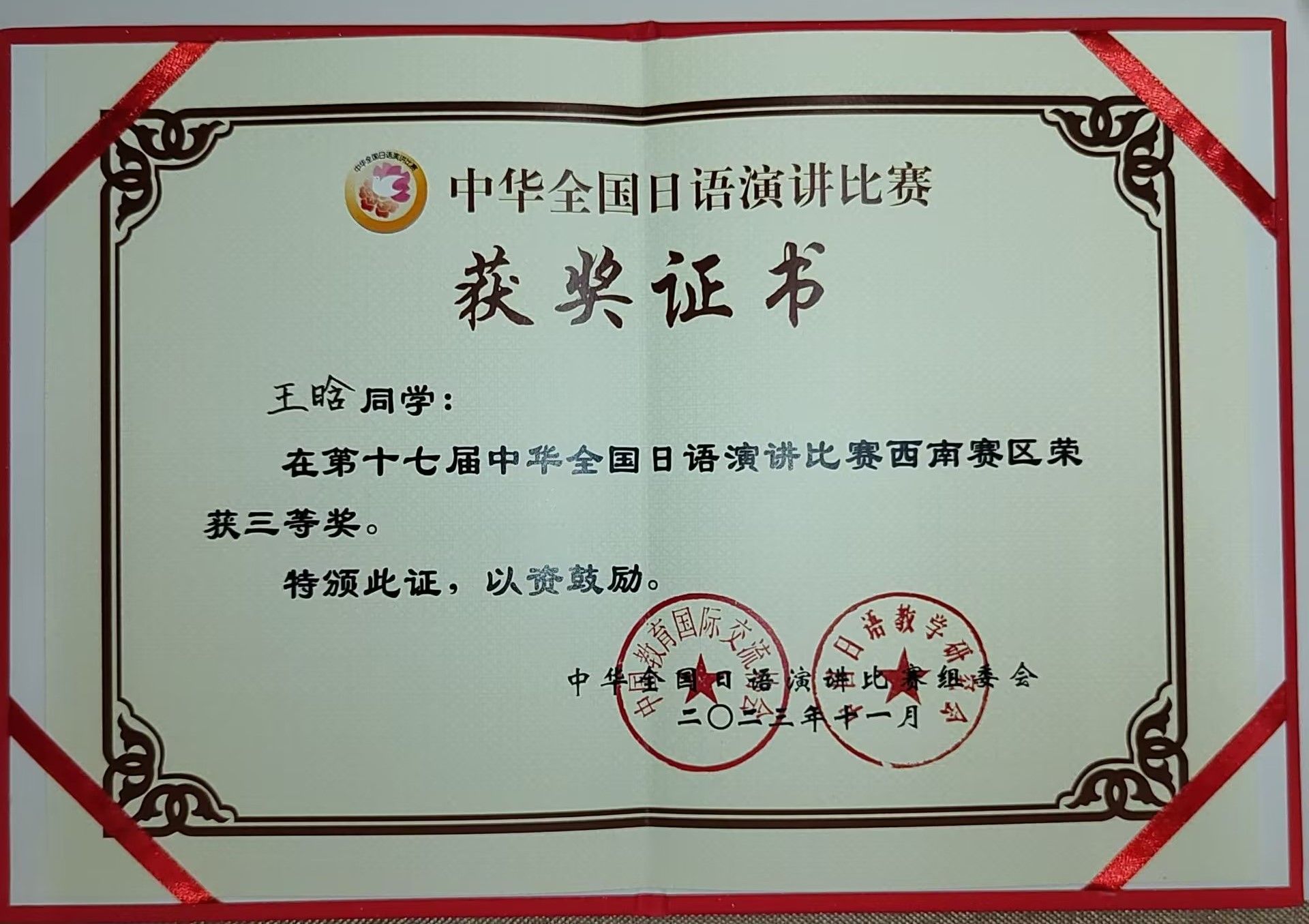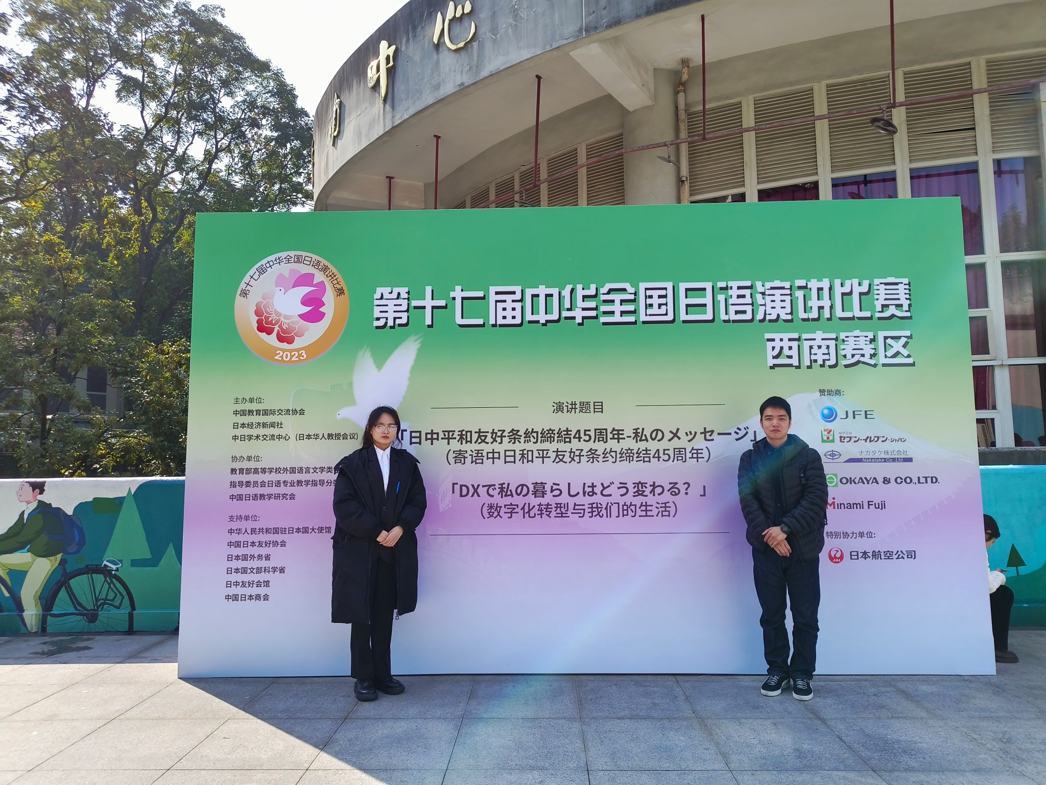 11月下旬,在西南大学举行了第十七届中华全国日语演讲比赛西南赛区决赛。我院日语教师西岗诚刚、张鸿鹏老师指导的2021级日语系学生王晗代表我校参赛,获得三等奖。本届大赛的主题为“寄语中日和平友好条约缔结45周年”与“数字化转型与我们的生活”。经过严格的第一轮命题演讲预选,共有包括我校在内的,来自四川大学、四川外国语大学、电子科技大学、西南大学、西南交通大学等30所院校的30名优秀选手突出重围参加本次决赛。即席演讲部分,选手需要在听到题目后的10秒钟内迅速做出反应和回答,对于选手的日语综合能力和思辨能力以及临场应变能力有着极高的要求。王晗沉着冷静,稳定发挥,经过激烈角逐,最终荣获西南赛区三等奖的好成绩。